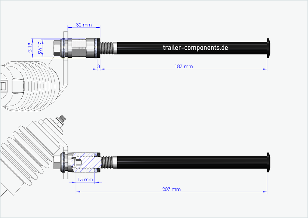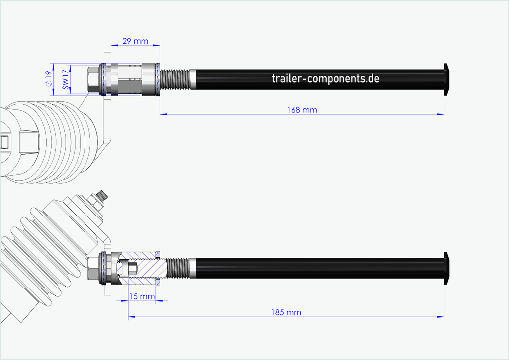 - È responsabilità dell'utente determinare la corretta dimensione della filettatura e la lunghezza di installazione [mm] dell'attuale perno passante sulla ruota. Non tentare di montare il nostro perno passante con adattatore in una dimensione di filettatura diversa nel mozzo della ruota posteriore. Una filettatura non corretta può danneggiare la bicicletta. Se non siete sicuri della corretta dimensione della filettatura e della lunghezza di installazione, contattateci via e-mail o telefono e saremo lieti di aiutarvi.