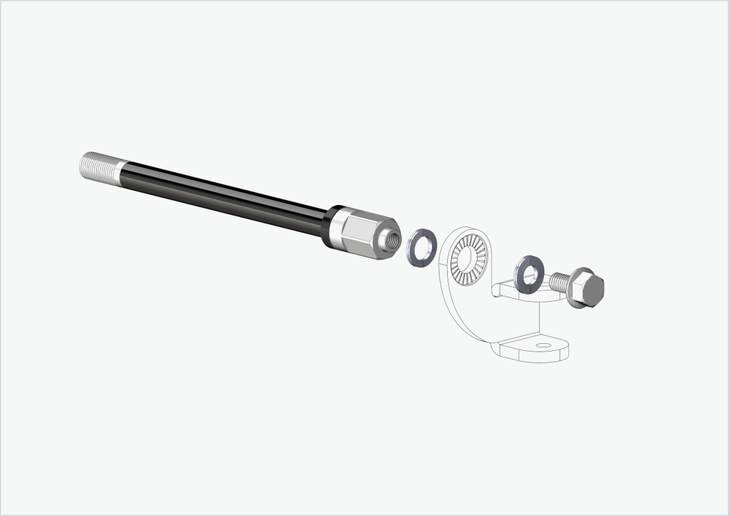 - È responsabilità dell'utente determinare la corretta dimensione della filettatura e la lunghezza di installazione [mm] dell'attuale perno passante sulla ruota. Non tentare di montare il nostro perno passante con adattatore in una dimensione di filettatura diversa nel mozzo della ruota posteriore. Una filettatura non corretta può danneggiare la bicicletta. Se non siete sicuri della corretta dimensione della filettatura e della lunghezza di installazione, contattateci via e-mail o telefono e saremo lieti di aiutarvi.